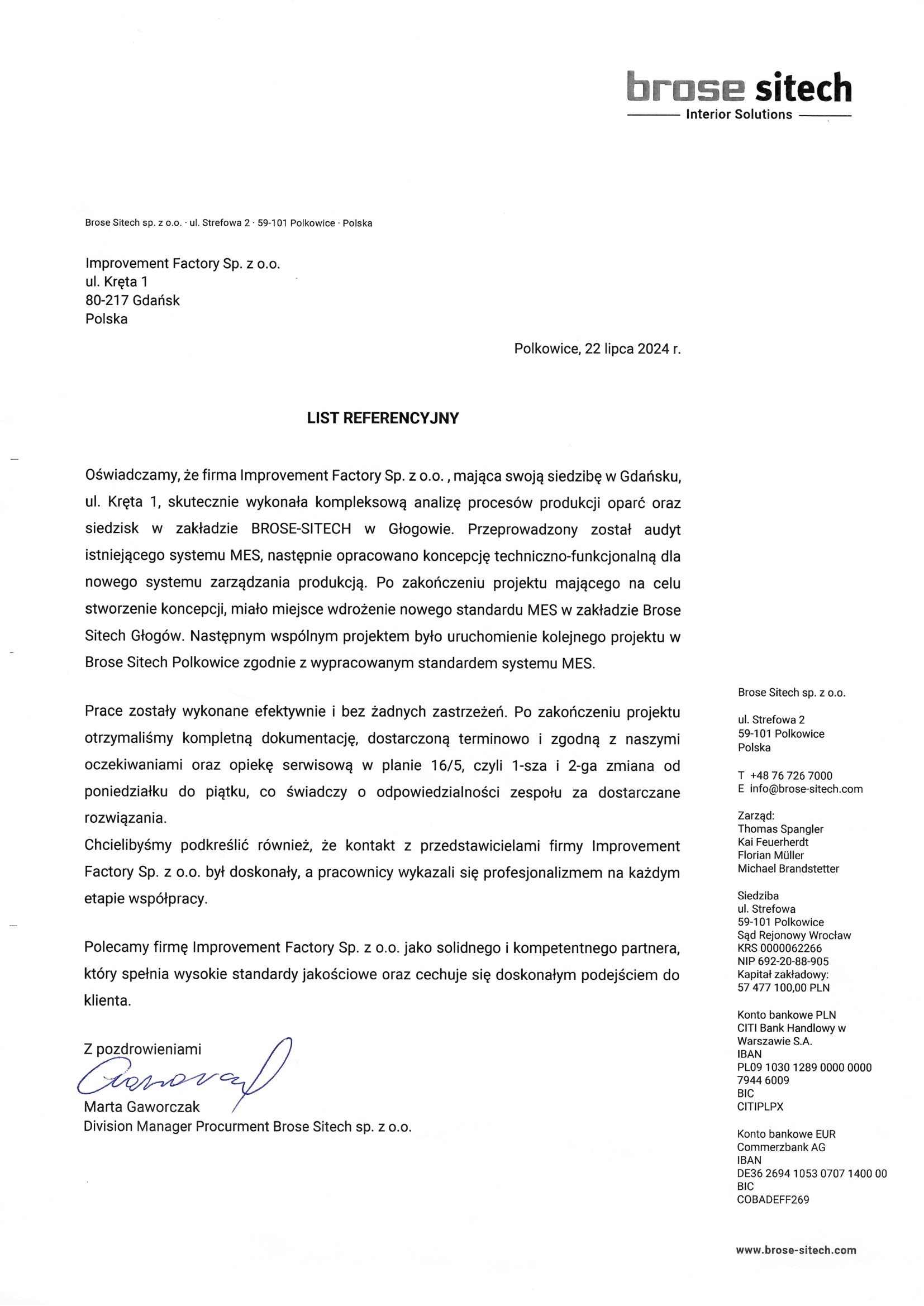 Poniżej oficjalna referencja Brose Sitech dla ImFactory: